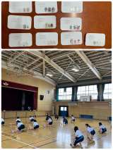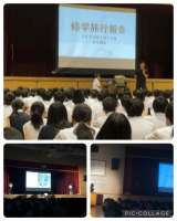 体育館では三年生による広島平和学習(修学旅行報告会)と終業式が全校生徒参加のもと...