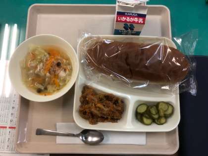 じゃがいものミートグラタン スープ きゅうりのピクルス 黒糖パン 牛乳