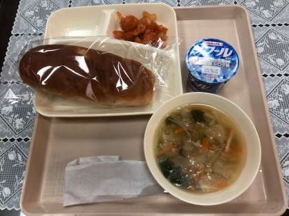 えびのチリソース 中華スープ ヨーグルト レーズンパン 牛乳