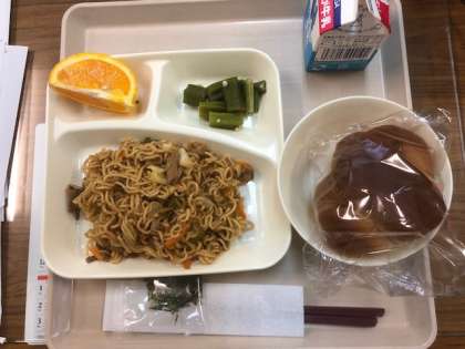 焼きそば オクラのかつお梅風味 オレンジ 黒糖パン1/2 牛乳
