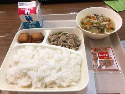 ゴーヤチャンプルー すまし汁 あつあげのしょうがじょうゆかけ ごはん 牛乳
