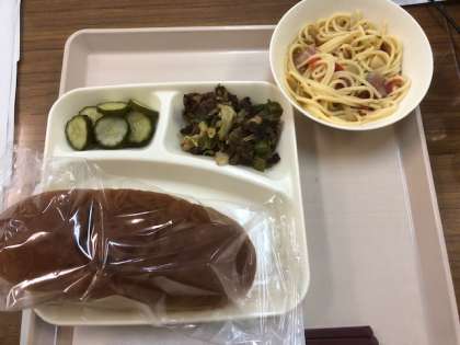 牛肉のカレー風味焼き トマトのスープスパゲティ きゅうりのピクルス パン 牛乳
