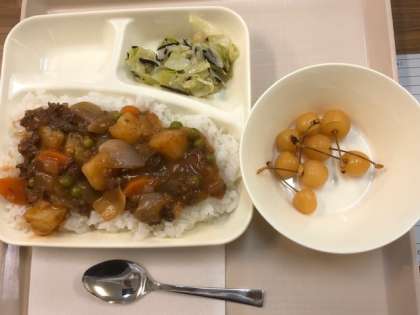 ハヤシライス キャベツのひじきドレッシング さくらんぼ 牛乳