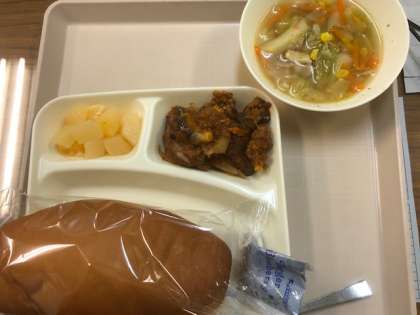 なすのミートグラタン 鶏肉と野菜のスープ 白桃 ブルーベリージャム パン 牛乳
