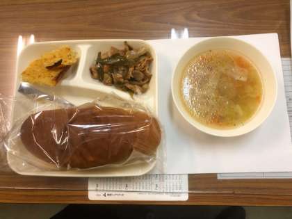 豚肉と野菜のケチャップソテー スイートポテト スープ パン 牛乳
