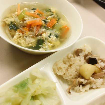 今日は中華メニューです。中華おこわと卵スープ、キャベツのオイスターソースいため。おこわは栗やチャーシューが入っています。