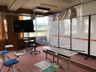3年2組が授業を行う学習センターに飛沫防止のシートを設置しました。