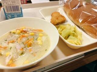 サーモンフライ コーンクリームスープ キャベツのカレーソテー コッペパン いちごジャム 牛乳