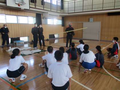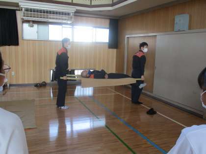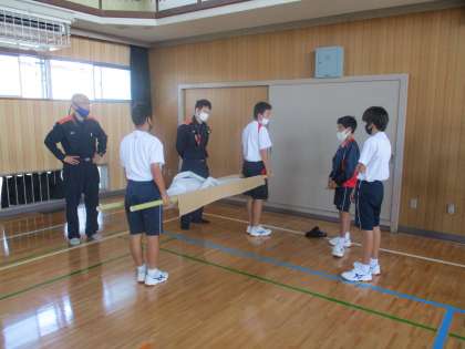 竹竿と毛布で担架を作り、負傷者搬送訓練をしました。