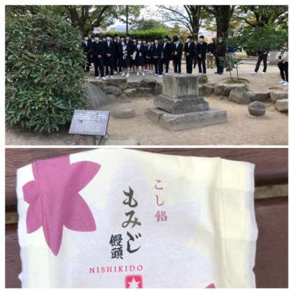 平和公園の碑巡りのあと、もみじ饅頭をいただきました。これからバスで広島から萩へ向かいます。