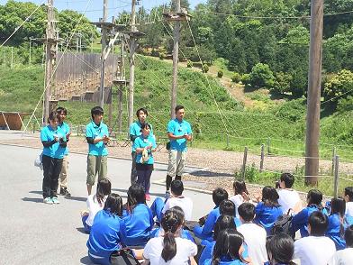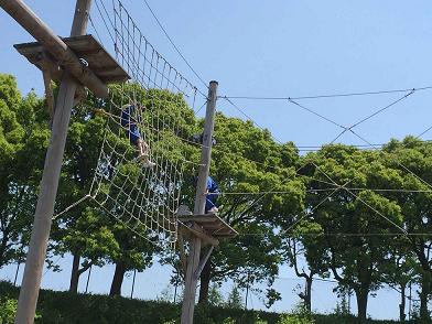 命綱をつけて、地上8mの18種類のアスレチックに挑戦しました。高いところが苦手な人もいますが、指導員の方の「一歩を踏み出す勇気を」という言葉に周りの仲間の応援あり、参加者は全員頑張ってゴールしました。