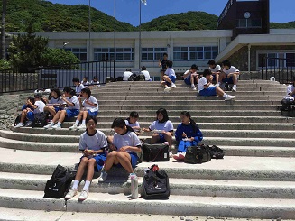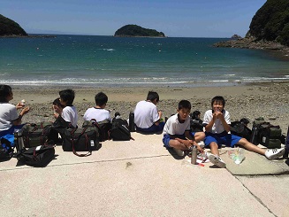 学校での出発式では、生徒代表の挨拶・諸注意が行われ、バスで一路日高方面へ。途中紀ノ川サービスエリアでトイレ休憩のあと昼前に堺市立日高少年自然の家に到着。眼前に広がるきれいな海にみんな歓声を上げ、海岸でクラス写真と昼食です。