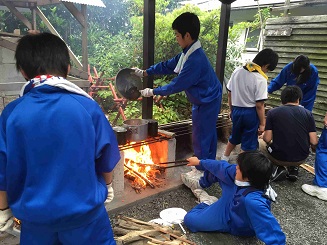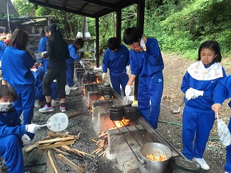 最後の活動は野外炊飯。かまどの準備・食器の用意・食材の準備や調理など係りを分担・協力してカレーを作りました。