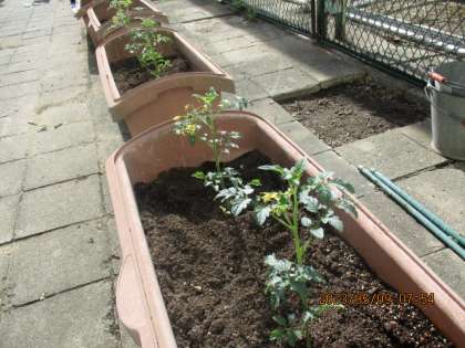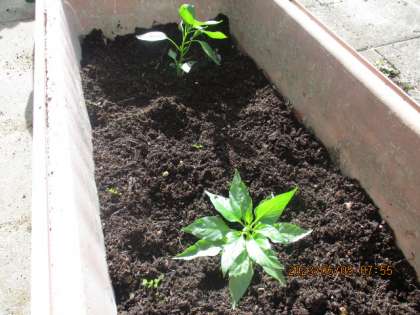 プランターや花壇に、特別支援学級の子どもたちが「プチトマト」「キュウリ」「トウガラシ」「シシトウ」「ピーマン」「オクラ」の苗を植えました。