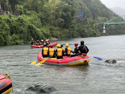 雨の中でも、楽しそうにラフティングを行っています。