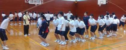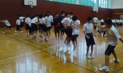 雨が降り出し砂浜での活動を切りあげて、体育館で夜レクに向けて大縄飛びの練習をしています。