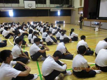 本日は平和人権学習登校日で久しぶりにたくさんの生徒が登校し、短い時間ですが平和について考える時間をもちました。