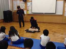クラスごとに多目的室での「AEDを活用した救急救命処置法」とプールを利用しての「可搬式ポンプの使用訓練」を体験しました。いざという時のために、『自助』力の向上を図れるように役立てたいものです。