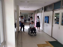 車いす体験では、班で車いすの利用者役・介助者役を決め、校舎内を移動しました。