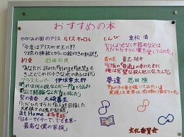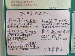 文化委員会からは『おすすめの本』が掲示板に紹介されています。各教室にある学級図書や図書館を利用して好きな本を読むなど、この機会にチャレンジしてください。
