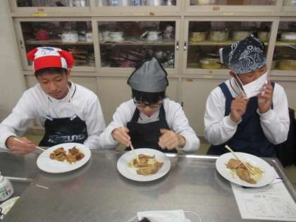自分たちで作った豚肉のしょうが焼きをおいしくいただきました。