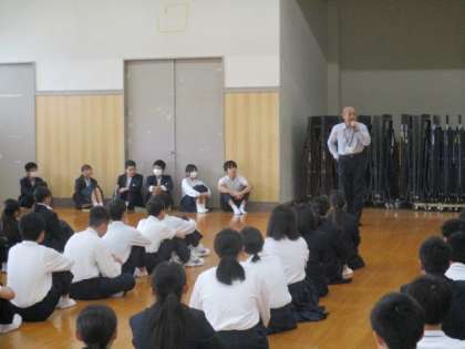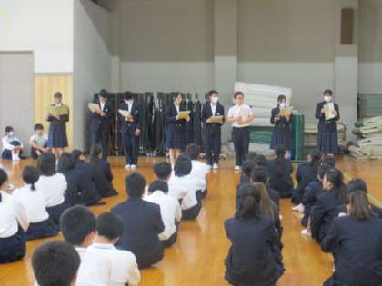 生徒会をはじめ、皆さんの代表として前に立って話をしてくれる勇気あるメンバーです。皆さんも、静かに集中して聞いていました。これからも、みんなが協力し合える学校をつくっていきましょう!