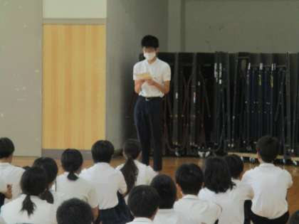 生徒指導主事 萱村先生からの夏休みの過ごし方についてのお話がありました。皆さん、しっかりと聞くことができていました。