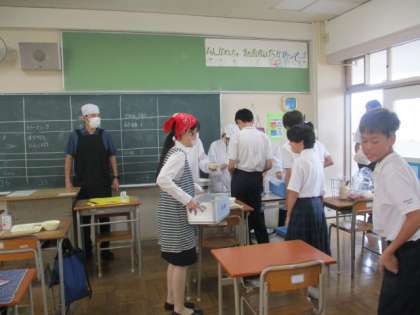 昨日から教育実習生として来られ、皆さんと一緒に給食準備をしている様子です。