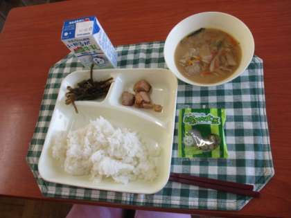 今日の献立は、まぐろの甘辛焼き、豚汁、くきわかめのつくだ煮でした。