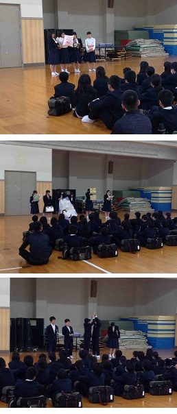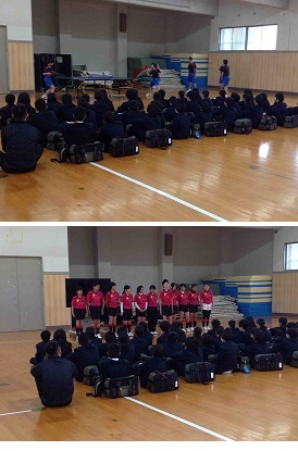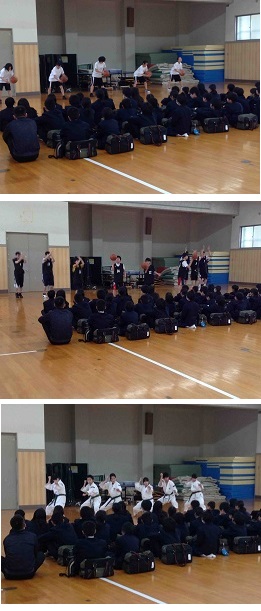 放課後、体育館で1年生にむけてクラブ紹介が行われました。残念ながら、生徒数の減少や顧問の先生の異動により、募集する部活動が減りました。