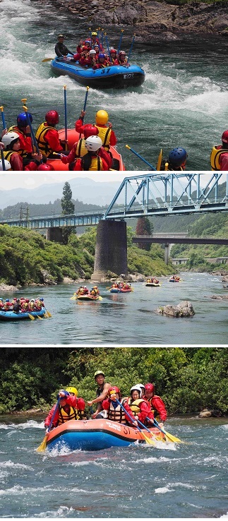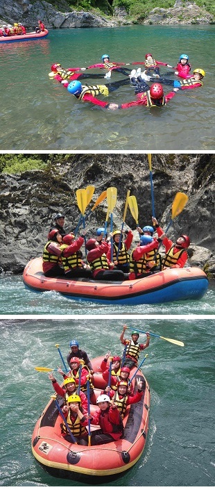 本日も快晴。バスで宿舎を出発し、ホテル郡上八幡に到着。ウェットスーツに着替え、ライフジャケット・ヘルメットをつけバスでスタート地点まで移動!