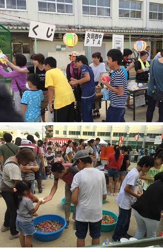 毎年子どもたちの健全育成のため、地域・学校が協力して行われている行事で、ゲームコーナー・模擬店・舞台・花火師による花火の打ち上げが行われます。