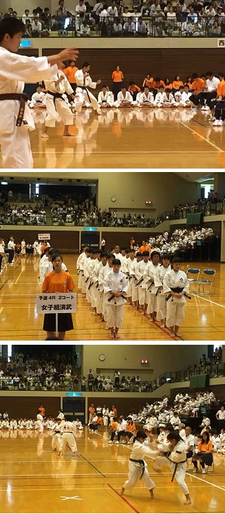 開会式直後の予選で、本校からは男子単独演武1名・女子組演武2組(4名)が出場し、女子組演武で1組が難関を突破し、2日目の準決勝に出場することができました。