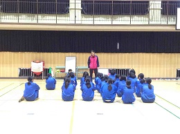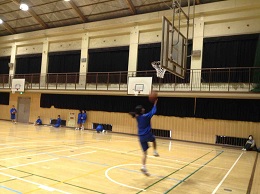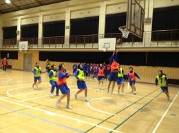 体育館で準備運動の後、バスケットボールの基本的な個人技能として、シュート練習(30秒シュート)・ドリブル〜レイアップシュート、そしてチーム(5人)でオールコートでのボールの運び方(縦パス)の技能を身につける練習などがおこなわれました。