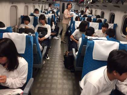 車内では朝が早かったせいか、寝てる生徒もいれば、トランプなどを楽しむ人もいます。