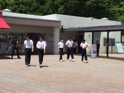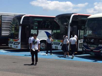 サービスエリアにてトイレ休憩。バス内では、疲れて寝ている生徒が多いです。