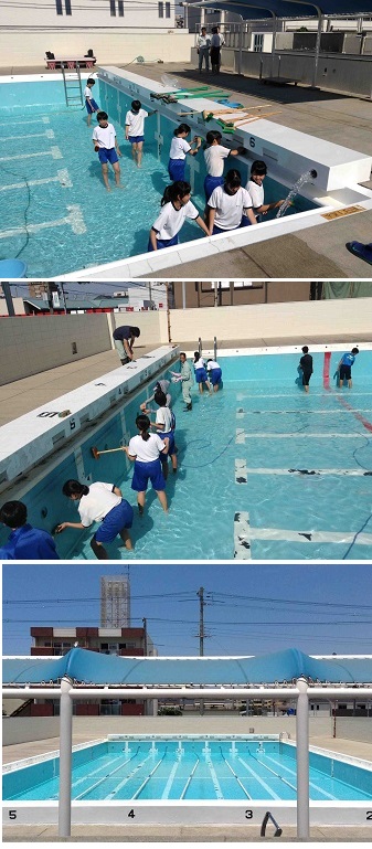 ・本日体育委員に加え、ソフトテニス部の部員も手伝いプールの清掃を行いました。