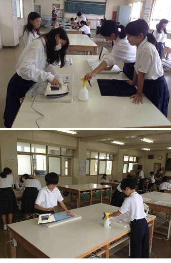 被服室で、布の折り目の箇所に霧吹きをして、慣れない手つきでアイロンをあてていましたが、何事も経験です。