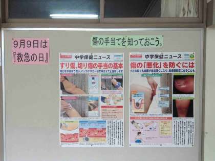その一つに『救急の日』というのがあります。本校の保健室前にも、保健室の先生が、ポスターとともに掲示してくれています。