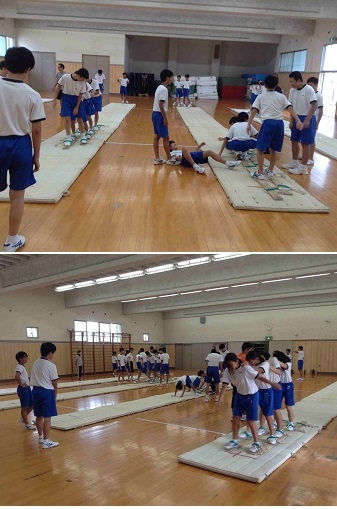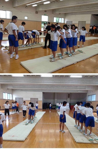 学年種目の『ムカデ競争』も体育館にマットを敷いての練習となりましたが、声を合わせて、行ってました。