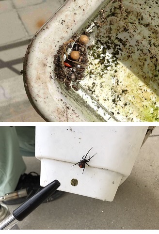 ・校内で管理作業員さんが、使用していない古いプランターから、セアカゴケグモ(メス)と卵のうを発見し、駆除してもらいました。