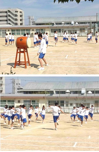 昼休み、運動場で弐団が体育大会の応援練習をしています。