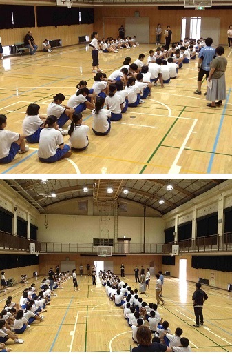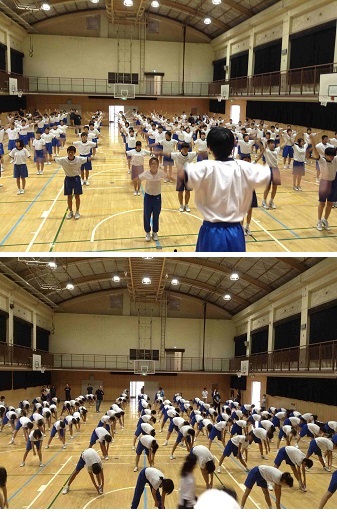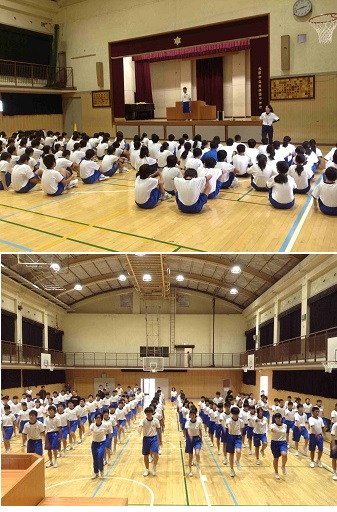あいにくの雨で、体育館で諸注意・入場行進・ラジオ体操・3学年合同縦割り種目の綱引きの隊形の確認など行いました。