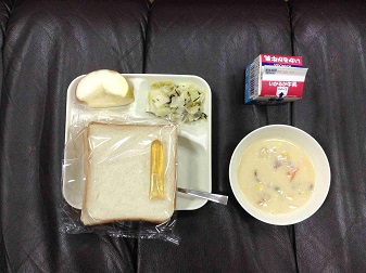 ・本日の給食はコーンクリームシチュー、キャベツのひじきドレッシング、りんごです。