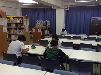 部によっては、テスト前の学習会を開いているところもあり、図書室やLL教室で自主学習をしています。