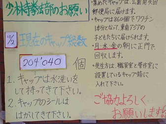 生徒数も少ないため、集まるのに時間もかかりますが、継続することで20万個を越えました。