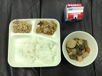 ・本日の給食は豚肉のねぎだれかけ、ふきよせ煮、ツナ大豆そぼろでした。