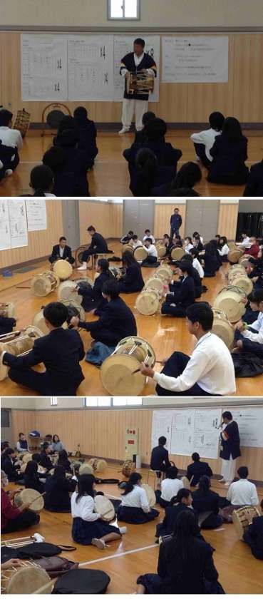 2年生全体で、韓国・朝鮮の伝統楽器であるチャンゴ・プㇰなどの歴史や基本的な叩き方を学び、演奏を行いました。