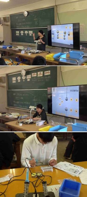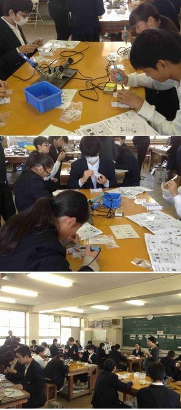 「どこでもライト」の製作の過程で、はんだ付けの仕方を学ぶところです。細かい作業ですが、うまく書画カメラを使用して、失敗例や良い見本を分かりやすく説明した後で、作業に入っていました。
