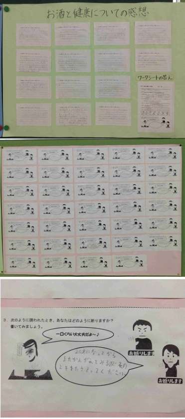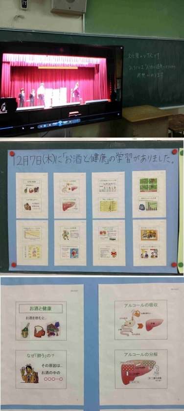 2年生の懇談控室では、前では文化祭の学年の舞台発表のVTR、後ろには「お酒と健康」についての学習のまとめが見れるようにしてありました。
